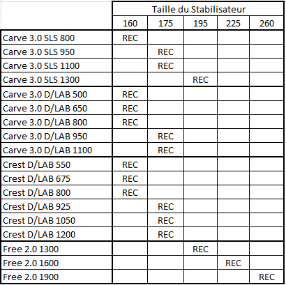 Voici la liste des recommendations de taille
